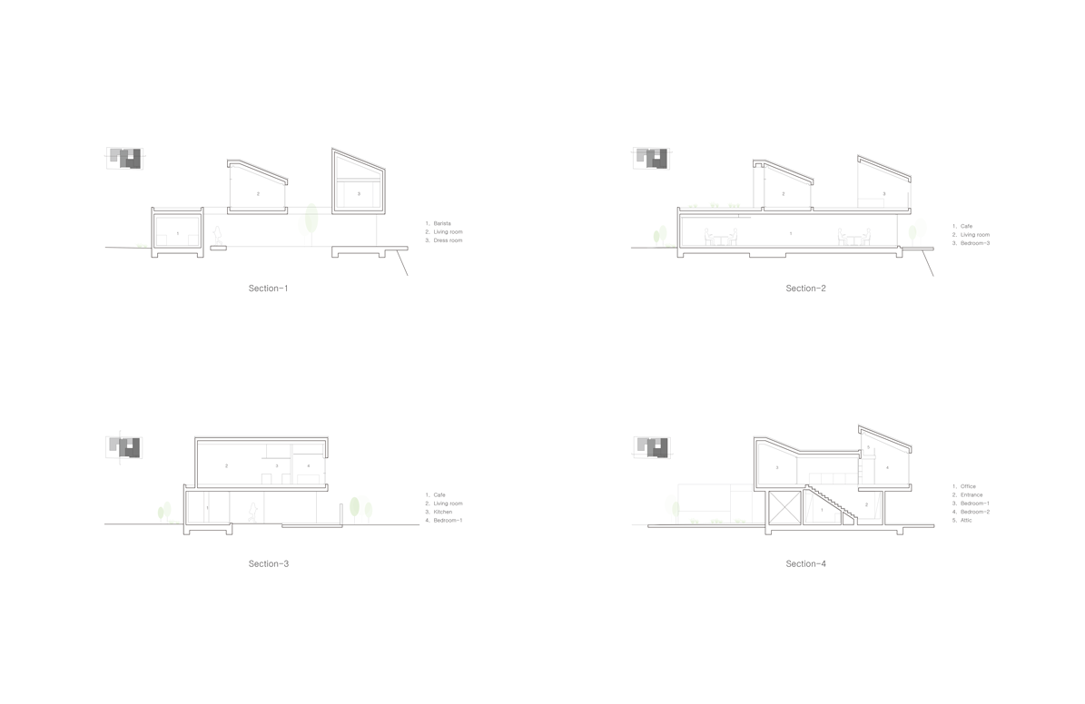 지구단위계획 지침과 같은 이러한 규제수단은 건물의 용도, 규모와 형태, 건물과 외부공간의 관계, 지붕의 형태 등을 통제하여 도시의 미관을 개선하고 양호한 환경을 확보하는데 용이한 법적 수단이지만, 때로는 건축주 개인의 꿈과 건축가의 상상력을 방해하는 요인이 되기도 한다. 건축주의 요구는 부부가 운영할 작은 카페, 프라이버시가 보호되면서 마당이 있는 집, 두 개의 프로그램이 통합되어 한 건물에 존재하지만, 분리된 공간이었다. 요구조건을 수용하려면 건물의 배치와 상가&주거의 면적비율, 형태 및 재료 등 지구단위계획 지침의 규제를 활용하면서도 다름을 위해 재해석하려는 노력이 필요하다. 상가비율과 주거비율이 4:6, 물매 4/10 이상 경사 지붕의 비율이 전체 지붕의 50% 이상이라는 규정을 적용했다. 주변 다세대주택으로부터 개방되면서 보호되는 구조로 공간을 구분 짓는 방식을 택하여 상업공간과 주거공간의 완전한 분리를 제안하였다.