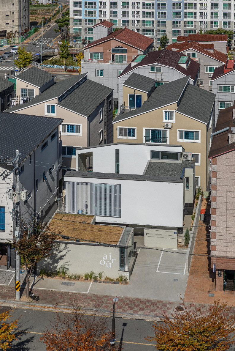 거제도 조선산업의 배후 주거지 역할을 하는 아주택지개발지구에 주변 다세대주택들과는 사뭇 다른 집이 있다. 1층은 노출콘크리트, 2층 전면은 흰색페인트로 마감한 건축물이다. 중정으로 진입하면 부부가 운영하는 작지만 외부공간이 여유로운 카페(ajour 아주르 [건축] 채광창, (채광을 위한) 틈새[구멍]가 있고, 철문을 지나 계단을 올라가면 세 가족을 위한 중정을 품은 세상을 만날 수 있다. 아이와 일상을 담은 집 [dduddu house-아이의 이름을 따 지은 집] - 뚜뚜하우스이다.집의 추억을 공유하는 과정 속, 다른 생각의 가치